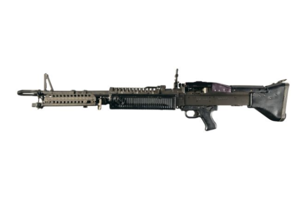 Developed in the late 1950s, the M60 was designed as a general-purpose machine gun (GPMG), a single weapon to replace as many different .30 caliber machine guns in the Army inventory as possible. The M60 was deployed as the chief infantry machine gun for Vietnam, along with a variety of air, ground, and water vehicle mountings. While other designs started to fill the infantry niche from the 80s onward, the M60 is still a frontline automatic weapon with American and allied armed forces. This example is built around a receiver made by Rock Island Armory (located near, but not connected to, the Rock Island Arsenal). The barrel is equipped with a fixed blade front sight, elongated bird cage flash hider, and swiveling bipod. The receiver trunnion is fitted with the quick release hardware for the barrel and folding ladder rear sight, with the manufacturers markings on the left side and bottom of the receiver. Fitted with a ventilated barrel shroud, ribbed forearm and pistol grip, and a plastic buttstock with a flip-up shoulder rest. Included with the lot is a tripod, T&E unit, and manual. Provenance: The Al Walker Collection
